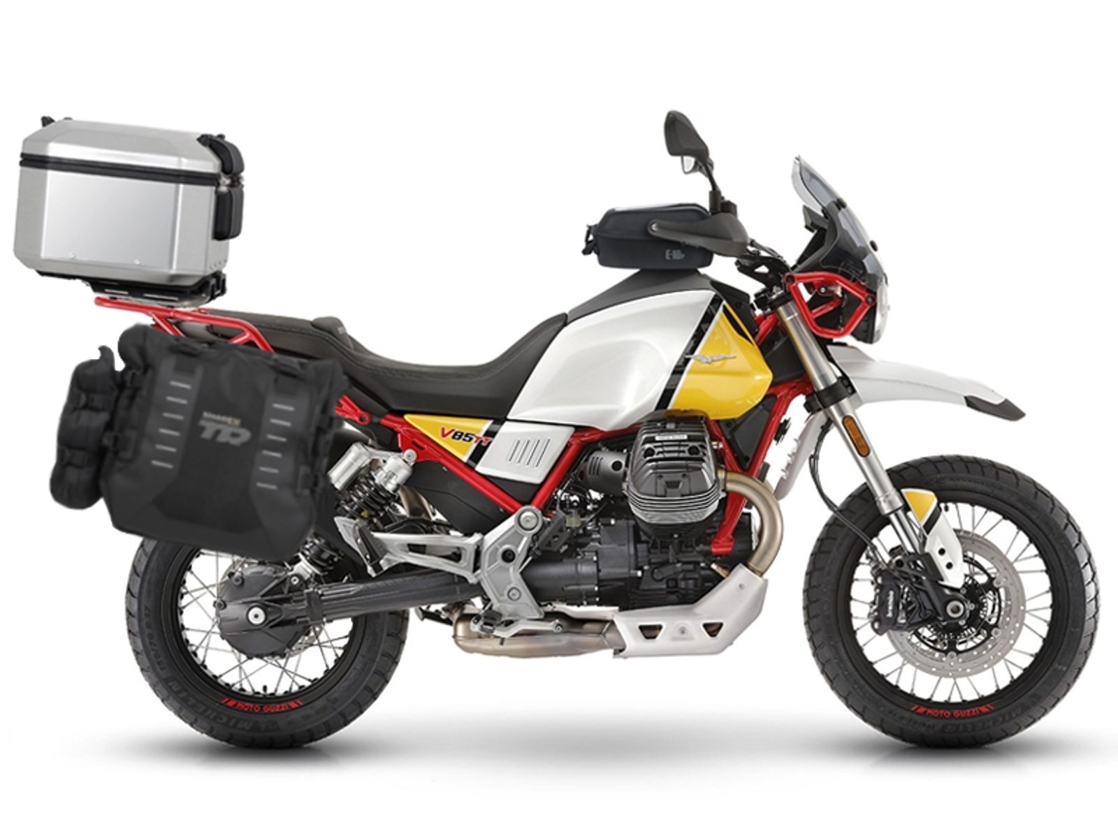 Complete set of SHAD TERRA TR40 adventure saddlebags and SHAD TERRA aluminium 48L topcase, including mounting kit SHAD MOTO GUZZI V 85 TT