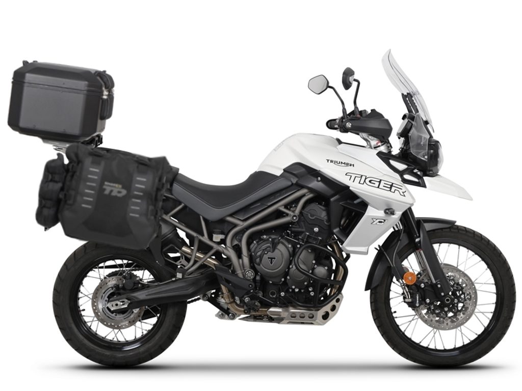 Complete set of SHAD TERRA TR40 adventure saddlebags and SHAD TERRA BLACK aluminium 37L topcase, including mounting kit SHAD TRIUMPH Tiger 800