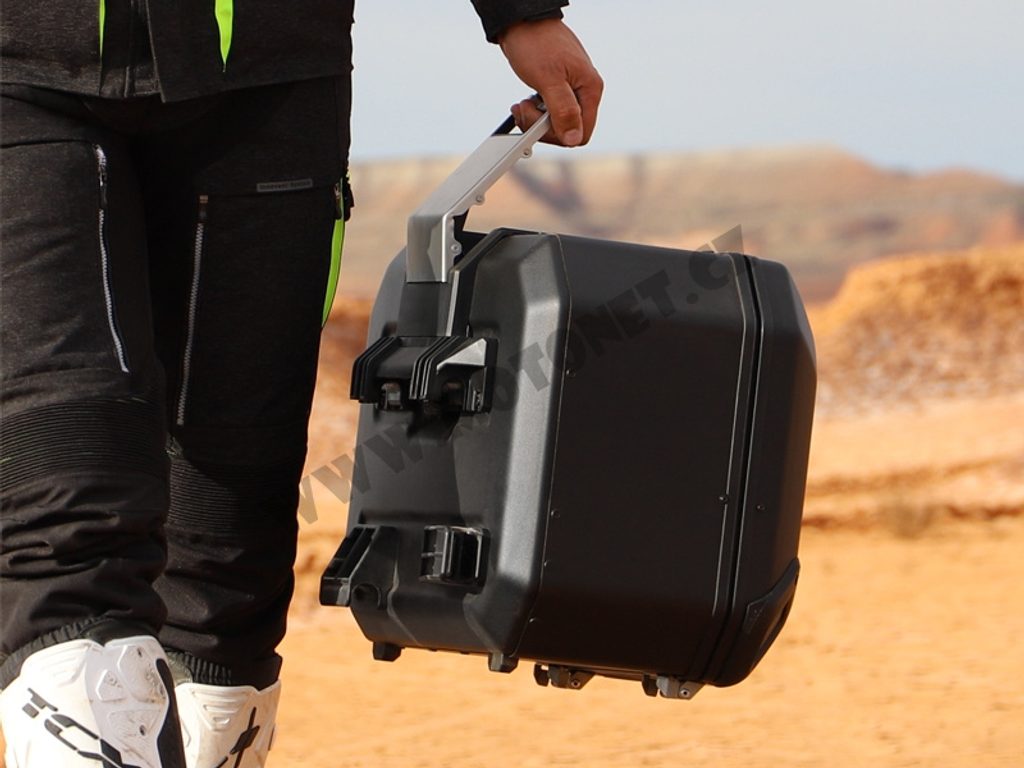 Unikátní integrovaný mechanismus zámku a madla umožňuje jednoduché ovládání jednou rukou a snadnou demontáž z motocyklu.