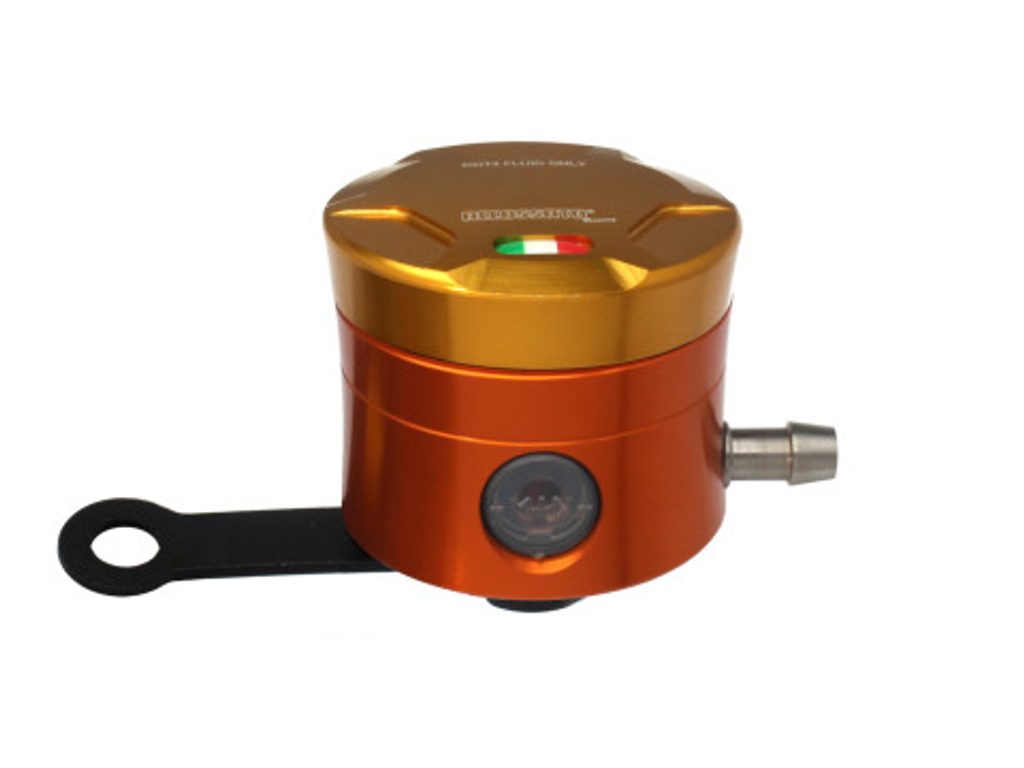 Accossato CNC-worked brake fluid reservoir, capacity of 25 cm3, horizontal oil spill. Straight braket provided. You can choose the colour match of the