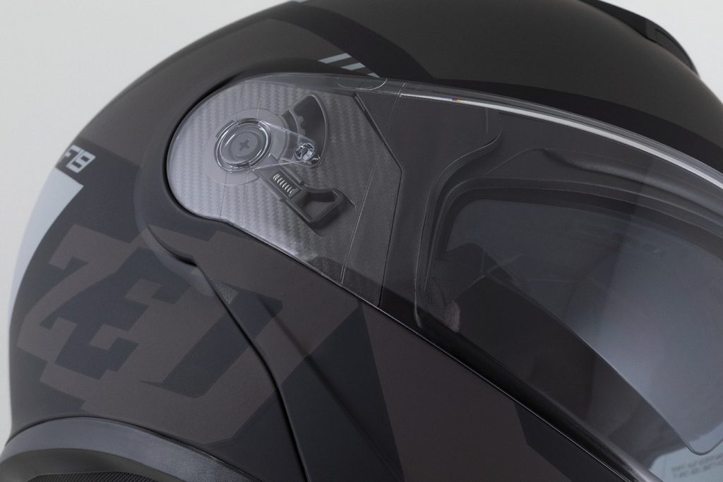 • Rychloodepínací mechanismus plexi s více polohami nastavení pozice a jazýčkem pro docvaknutí plexi v zavřené pozici.