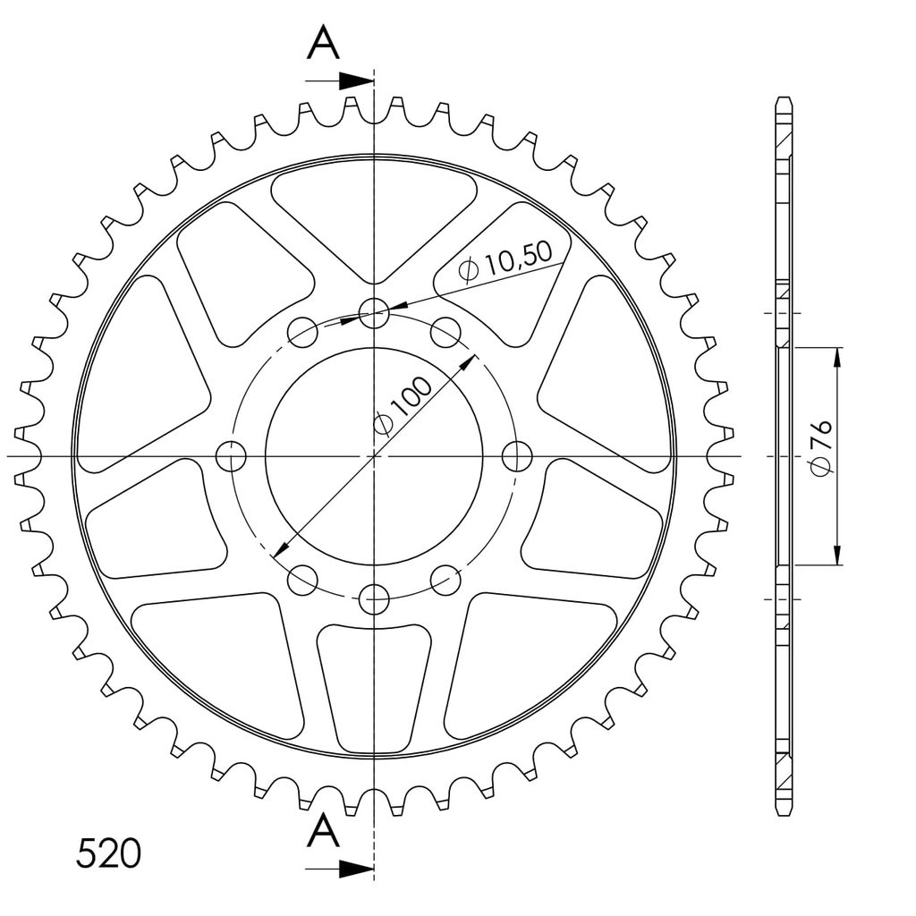 Pevnější zuby = vyšší životnost řetězové sady až o 10%. Rozeta 48z, řetěz 520.