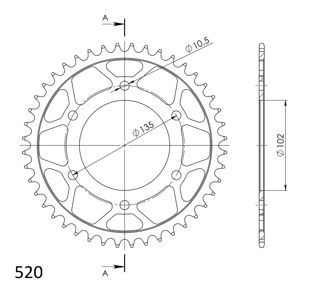 Pevnější zuby = vyšší životnost řetězové sady až o 10%. Rozeta 44z, řetěz 520.
