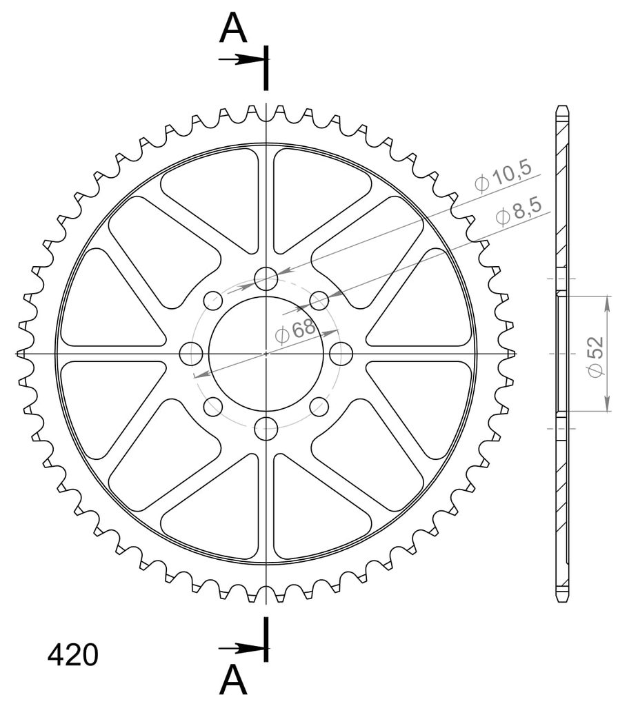 Pevnější zuby = vyšší životnost řetězové sady až o 10%. Rozeta 54z, řetěz 420.