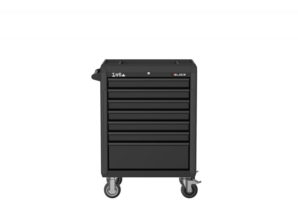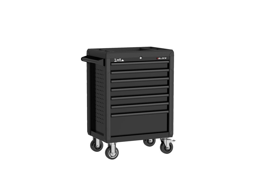Tool storage trolley L. 680 mm with 7 drawers with key lock. Equipped with upper plastic tray with small parts compartments and perforated side tool holder panel. Handles and side bumpers.