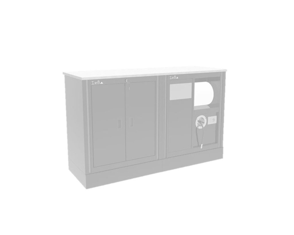 Racing bench with 2 doors cabinet and service module with rubbish bin, paper holder, socket and hose reel predisposition.